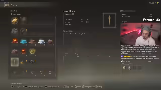 02:10:01Der Streamer und Alex sprechen über ihre Elden Ring-Erfahrungen und die Herausforderungen des Spiels. Alex startet einen neuen Versuch und der Streamer kommentiert seine Vitrine und seine Katze. Der Streamer spielt weiter Elden Ring und findet Pest-Threads. Er erinnert sich an einen Run, den er an Melania verloren hat und der sehr gutes Zeug hatte. Der Streamer spricht über die Bosse im Tutorial und die Schwierigkeit, diese zu besiegen. Er versucht, einen Boss zu besiegen, scheitert aber. Der Streamer spricht über die Waffen, die er hat und die Schwierigkeit, die Bosse zu besiegen. Er macht einen neuen Versuch und versucht, die Bosse ohne zu sterben zu besiegen. Der Streamer spricht über einen früheren Versuch, bei dem er an 64 Bossen gestorben ist. Er findet eine Gravesive und hält diese für eine gute Waffe. Der Streamer spricht über einen früheren Versuch, bei dem er 140 Bosse besiegt hat. Er stirbt sofort und ist frustriert. Der Streamer spricht über den Blackblade Kindred und die Schwierigkeit, diesen zu besiegen. Er gibt zu, dass der Pokémon-Run noch lebt, aber er sehr erschöpft ist. Der Streamer hat viele Heiltränke verbraucht, um überhaupt weiterzukommen. Er spricht über einen früheren Run, bei dem er ein sehr gutes Pokémon hatte, aber durch einen Chat-Kommentar gestorben ist. Der Streamer spricht über die Herausforderung, die Waffen nicht aufzuleveln.