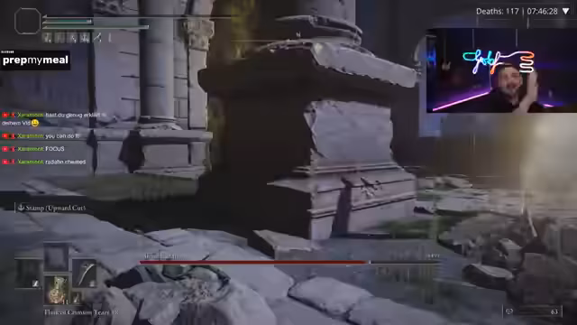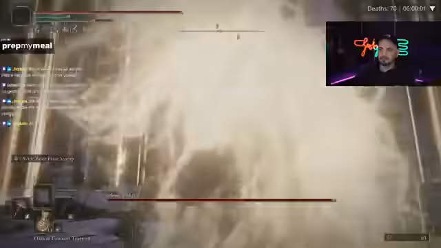 01:05:06Nach zahlreichen gescheiterten Versuchen gegen Radahn Phase 2 stehen der Streamer und der Chat vor der Entscheidung, den zweiten Boss, Miquella (Mimetier P2), zu versuchen. Beide Bosse gelten als extrem schwierig. Der Streamer analysiert die Schwierigkeiten beider Kämpfe. Während Radahn durch seine unübersichtliche Arena und seine Attacks behindert wird, ist die zweite Phase von Miquella wegen der Meteor-Angriffe als "einschüchternd" und "schrecklich" beschrieben. Es gibt keine idealen Lösungen und der Zustand der Waffen stellt eine zusätzliche Hürde dar.