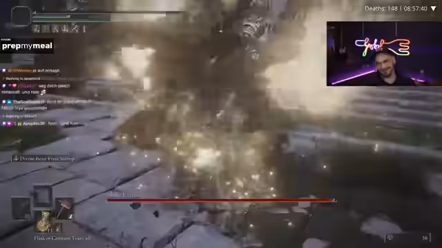 04:13:56Der Streamer kommt zu dem Schluss, dass das Kernproblem nicht die Waffe oder der Skill, sondern der DLC-Endgegner selbst ist. Der Boss ist nicht skaliert, hat aber enorme Ausdauer und macht extrem viel Schaden. Der Streamer resigniert etwas und stellt fest, dass der Kampf unfares RNG-Elemente enthält, die er nicht kontrollieren kann, wie zum Beispiel eine Attacke, die in Ecken unweichbar ist.
