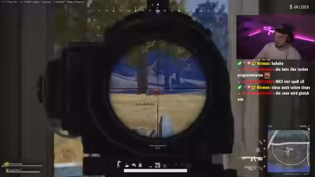 03:04:32Der Streamer sucht eine neue vorteilhafte Position und findet einen getöteten Gegner mit Beute. Ein verdächtiger Schuss wird im Westen vernommen, möglicherweise von einem Scharfschützen. Die genaue Herkunft des Schusses bleibt unklar, aber die Gegend wird als gefährlich eingestuft. Der Streamer beginnt die Beute des Getöteten zu sammeln. Der Partner feuert auf einen Gegner, der sich hinter einer weißen Mauer aufhält. Es wird eine plötzliche Bewegung eines weiteren Gegners von hinten registriert. Die Situation spitzt sich zu, als ein weiterer Gegner auftaucht. Die Kämpfe sind intensiv und erfordern schnelle Reaktionen.
