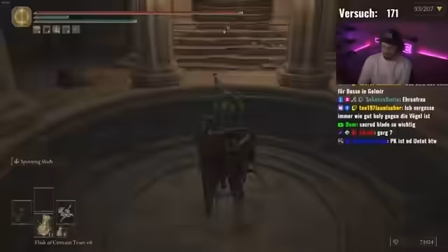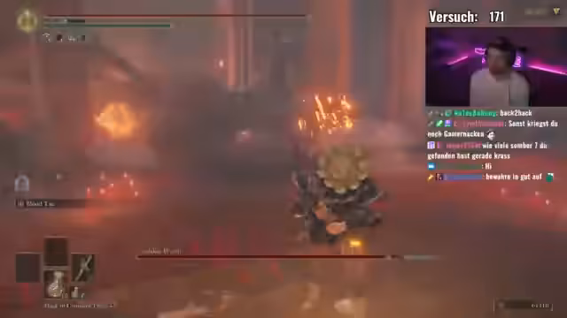 00:27:32Für die bevorstehenden Kämpfe passt der Streamer seine Ausrüstung und Taktik an. Er beginnt jeden Kampf mit der Blackknife-Taschenschere, um den Kampfablauf zu verlängern und 10% weniger Schaden zu erleiden. Aufgrund des geringen Schadens durch seine Hauptwaffe, die Mikkel and Night Sword, plant er, eine Waffe mit Heiligem Schaden zu finden, da der nächste Boss, Maliketh, gegen diese Schwachstelle anfällig ist.