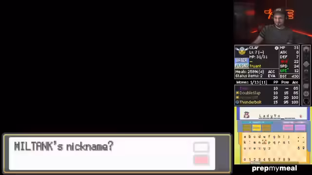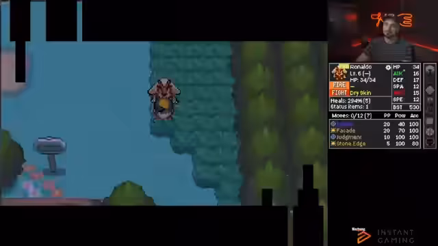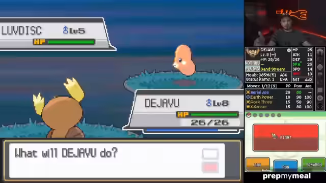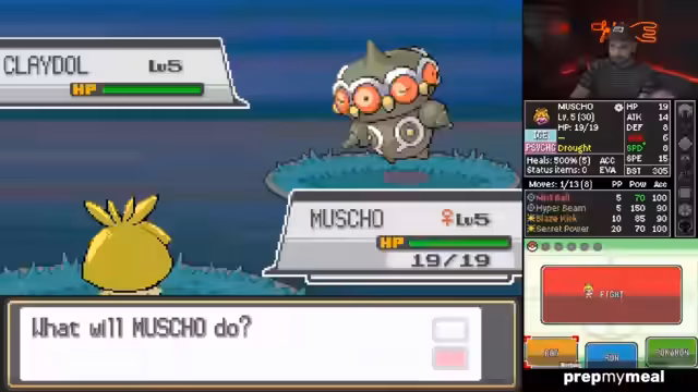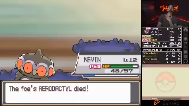 03:43:37Der Anfang des Runs ist von Pech geprägt. Nach vielen Fehlversuchen wurde mit 'Kevin', einem Pikachu, ein passendes Pokémon mit dem starken Angriff 'Thunderbolt' gefangen. Allerdings ist das Pokémon mit nur 41 HP und 9 Verteidigung ein Glass Cannon. Die Werte sind derart schlecht, dass selbst schwache Gegner eine ernste Bedrohung darstellen und der Run jederzeit scheitern kann.