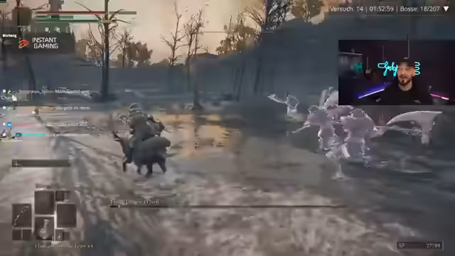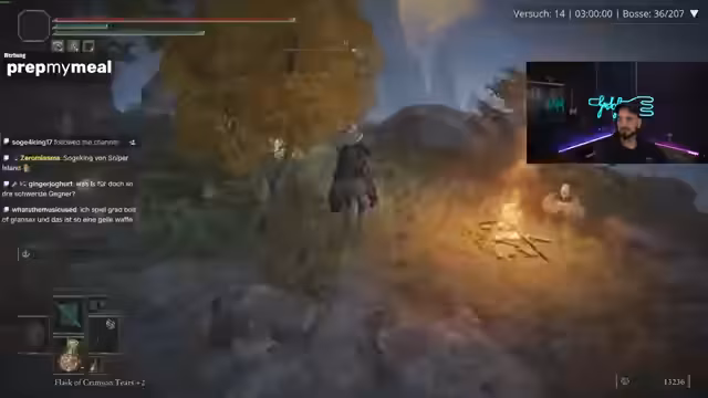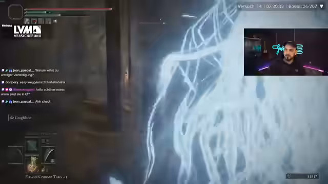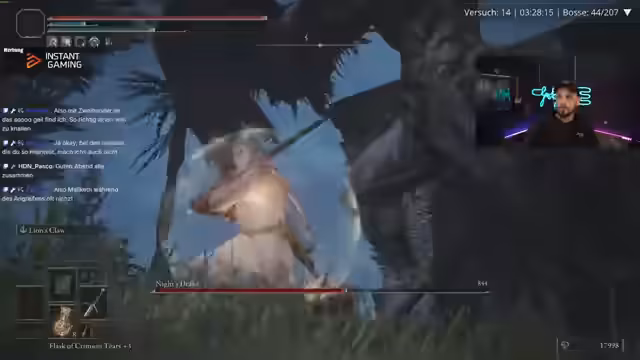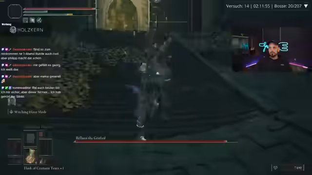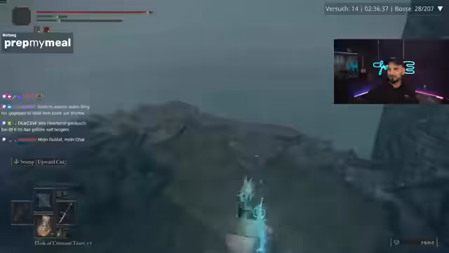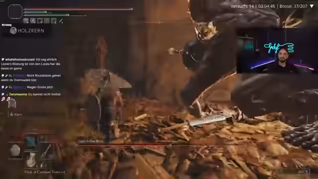 00:07:48Der Streamer spricht über die Schwierigkeiten der aktuellen Elden Ring-Challenge, bei der keine Gegenstände gewechselt werden dürfen. Er beklagt sich über die schlechte Startwaffe, die nur auf Plus zwei aufgewertet ist, und den negativen Talisman 'Magikas Scar Seal'. Das Team muss einen sehr starken Boss besiegen, was unter diesen Umständen extrem herausfordernd ist. Es wird überlegt, ob eine andere Waffe gefunden werden sollte, was jedoch das Risiko birgt, eine noch schlechtere zu erhalten. Die bisherigen Versuche, diesen Boss zu besiegen, waren erfolglos und frustrierend, da der verursachte Schaden zu gering ist. Die Gegner sind sehr stark und verursachen hohen Schaden, was den Kampf zusätzlich erschwert. Die Situation ist so aussichtslos, dass der Streamer die Strategie für den Kampf nicht mehr kennt und sich hilflos fühlt. Es wird diskutiert, ob bestimmte Aktionen wie das Schießen eines Great Bows vom Pferd aus überhaupt sinnvoll oder möglich sind, was verneint wird.