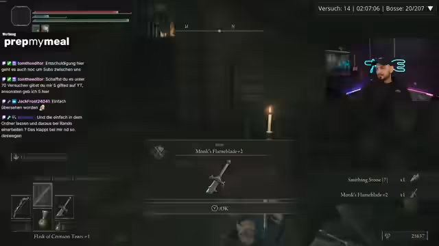 00:15:55Nach einem langwierigen Kampf, der sieben Minuten dauerte, äußert der Streamer seine Frustration über den schlechten 'Seed' (Startbedingungen) des Spiels. Er hat Schwierigkeiten, grundlegende Upgrade-Materialien wie 'Smithing Stones' und 'Somber Smithing Stones' zu finden, was die Aufwertung seiner Waffen unmöglich macht. Trotz des Fortschritts in neue Gebiete wie Stormvale, bleibt die Waffe auf einem niedrigen Level, was die Kämpfe unnötig in die Länge zieht und den Spielspaß mindert. Es wird spekuliert, dass dieser 'Seed' der schlechteste bisherige Versuch in der Challenge ist, da kaum gute Gegner gefunden wurden und das Aufleveln der Waffen extrem schwierig ist. Die Suche nach den benötigten Materialien führt zu weiteren Enttäuschungen, da stattdessen viele unnötige Waffen gefunden werden. Die Situation ist so frustrierend, dass der Streamer sich "komplett verarscht" fühlt und die Sinnhaftigkeit des aktuellen Runs in Frage stellt.