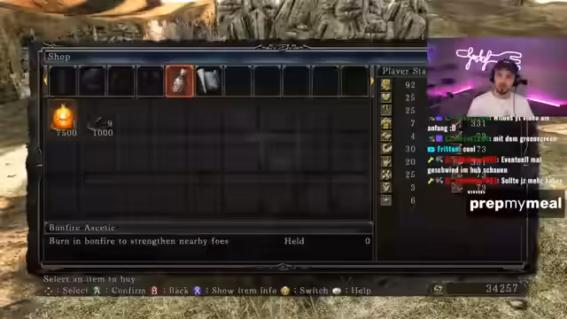 03:21:14Der Streamer erkundet weiter die Welt und findet einen Händler, der eine neue Rüstung verkauft. Er entscheidet sich, diese Rüstung anzunehmen, und stellt fest, dass sie ihm gut gefällt. Er sucht nach Titanit-Scherben, um seine Waffe zu verbessern, und findet mehrere Scherben in der Umgebung. Nachdem er genug Material gesammelt hat, beschließt er, seine Waffe zu verbessern und einen neuen Ring zu kaufen, um seine Attribute zu maximieren. Er plant, durch 'Shaded Wood' zu reisen und seine Waffe weiter zu stärken.
