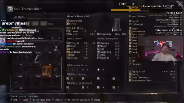00:09:29Nach der anfänglichen Konfusion erkundet der Streamer die Umgebung und stellt fest, dass das Spiel ein anspruchsvoller ist. Er kämpft gegen mehrere Gegner, darunter Drang Knight Hammers und Twinspears, und stellt fest, dass der Schaden, den er anrichtet, effektiv ist. Während des Kampfes lernt er, dass er einige Gegner umgehen kann, anstatt sie direkt bekämpfen zu müssen. Der Streamer sammelt verschiedene Items und Ringe, darunter den Dark Stone Plate Ring, der mehr Verteidigung für Dunkelheit bietet.