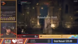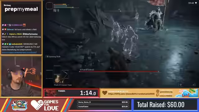 00:45:29Nach dem Neustieg im Spiel kämpft Gustav mit konsequent schweren Boss-Gegnern und ungünstigen Waffen, was seine Fortschritte erheblich verlangsamt. Die Spannung steigt, als ein Spendenanreiz ausgelöst wird, der ihn den Status 'Memory of Grace' erhält, was den Kämpfe zusätzlich erschwert. Dies führt zu einem frustrierenden Kampf gegen einen starken Gegner, bei dem Gustav aufgrund von mehreren gleichzeitig angreifenden Monstern mit verbesserter Verteidigung und Heilungsfähigkeit hohe Verluste erleidet und lange braucht, um den Boss zu besiegen.