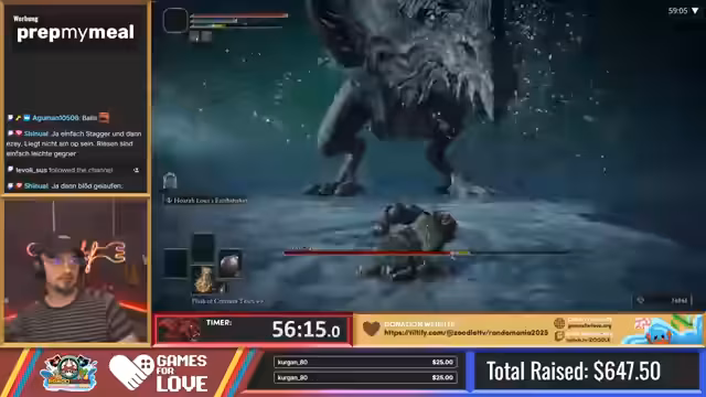 01:39:57Nach dem technischen Absturz wird das Spiel neu gestartet und Gustav muss einen zuvor besiegten Boss erneut antreten. Trotz des frustrierenden Rückschlags und weiterhin schlechter Waffenausrüstung gelingt es ihm, den Boss nach längerem Kampf zu bezwingen. Gustav bleibt dadurch in Kontakt mit seinem Konkurrenten Alex, der weiterhin im Vorteil ist. Der Wille, aufzuholen und die durch Spenden ausgelösten Strafen zu meistern, bleibt jedoch erhalten, auch wenn der Weg dahin beschwerlich ist.