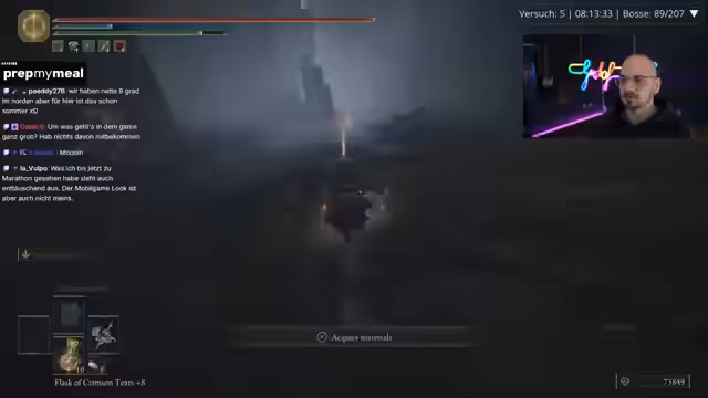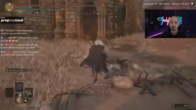 01:47:12Der Streamer erkundet ein gefährliches Gebiet mit mehreren Boss-Gegnern. Er bemerkt, dass der normale Weg ultra gefährlich ist, da die Angriffe der Gegner so ausgelegt sind, dass ein Ausweichen durch Panic Rolling nicht hilft und fast immer zum Treffer führt. Die Konfrontation mit den Bossen ist technisch anspruchsvoll und er muss sehr aufpassen, um nicht getötet zu werden.