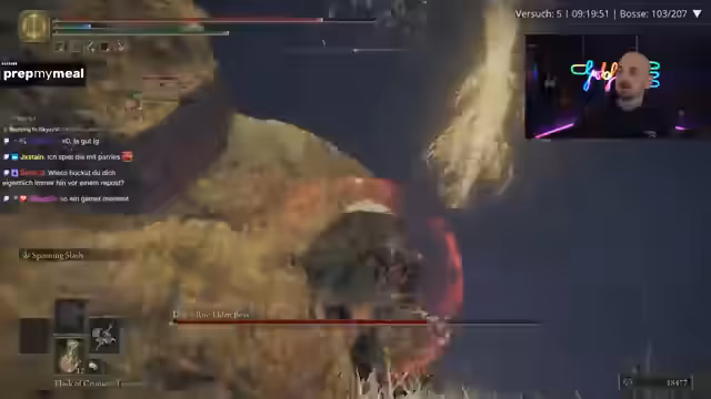 01:49:16Er erkennt einen entscheidenden Fehler bei der Wegwahl und stellt fest, dass er runter hätte gehen müssen. Der Bossgegner, ein sogenannter 'Buttes', greift an, indem er mit Projektilen wirft. Der Streamer ist gefangen und muss sich um die Situation kümmern. Er muss auf Angriffe reagieren, die ihn leicht hätten töten können, was zu einem sehr intensiven und angespannten Kampf führt.