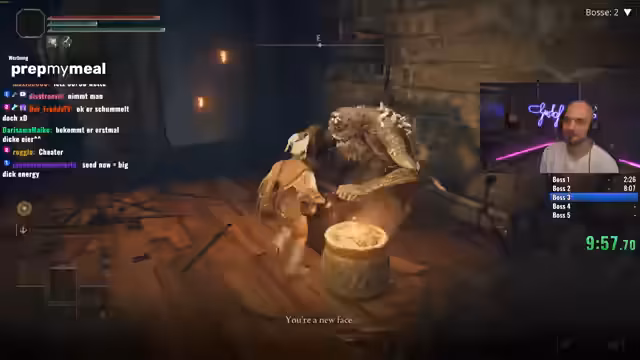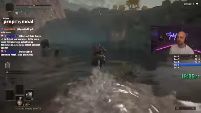 03:01:42Zu Beginn des Streams konfrontiert der Streamer einen extrem aggressiven DLC-Schwein-Boss, der ihn über eine weite Strecke der Karte jagt. Nach über 2500 Spielstunden erlebt der Streamer dieses Verhalten zum ersten Mal. Bei dem Versuch, das Tier zu bekämpfen, verliert er fast alle gesammelten Runen, was ihn frustriert, aber auch fasziniert, da es eine einzigartige und herausfordernde Situation darstellt. Er beschließt, dieses Schwein gezielt aufzusuchen, um den Kampf zu meistern, obwohl dies Zeit kostet und der Runenverlust spürbar ist.