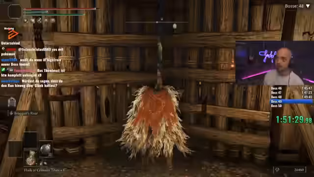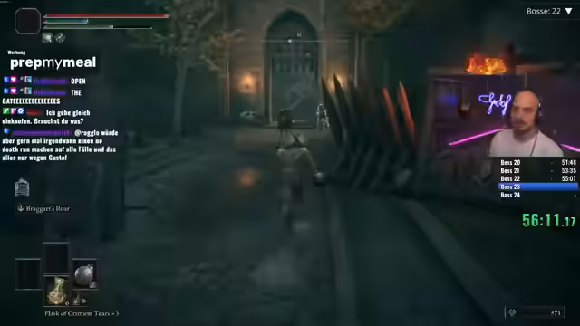 04:32:00Der Versuch, einen schnellen Boss-Rush in Elden Ring abzuschließen, endet knapp vor dem Ziel. Nach intensiven Kämpfen und einem riskanten Skip gelingt es, den Timer im Zielbereich zu halten und 55 Bosse zu besiegen. Das wird als großer Erfolg und sehr befriedigend empfunden, besonders da der Run neu gestartet werden musste und sich gelohnt hat. Der Streamer ist jedoch völlig erschöpft und kann nicht sofort einen weiteren Versuch starten.