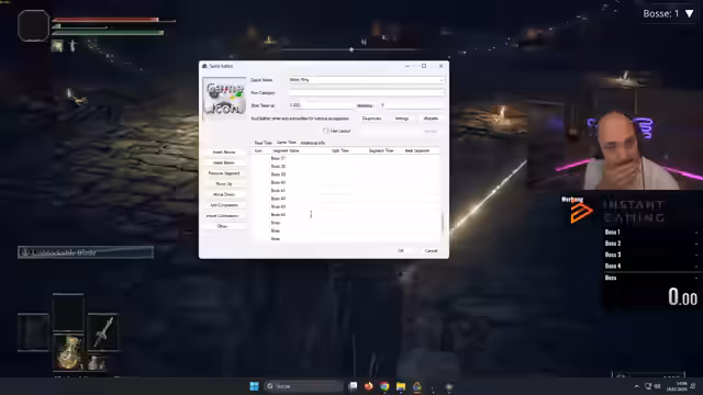 00:00:39Der Stream beginnt mit technischen Vorbereitungen für einen Speedrun. Der Streamer Gustaf Gabel möchte einen Autosplitter für Elten Ring nutzen, um die Zeit zwischen den Bosskäufen automatisch zu erfassen. Nach ersten Schwierigkeiten beim Einrichten des Live-Splitters versucht er, eine passfähige Konfiguration zu finden und stößt dabei auf Probleme mit der Funktionsweise, insbesondere bei der Auswahl von Segmenten und der Handhabung des Timers.