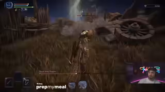 00:42:53Gustav beginnt mit dem Spiel Elden Ring mit der besonderen Herausforderung, nur mit Armbrüsten zu kämpfen. Er hat das Ziel, die bessere Drei-Schuss-Armbrust zu finden, welche aber selten ist. Nach anfänglichem Pech beim ersten Versuch, eine Armbrust zu finden, kämpft er sich durch das Schneeland und trifft auf erste Gegner. Ein durch die Fähigkeit 'Motte' erhaltener Buff sorgt für ungewöhnlich hohe Runen-Ausbeute.