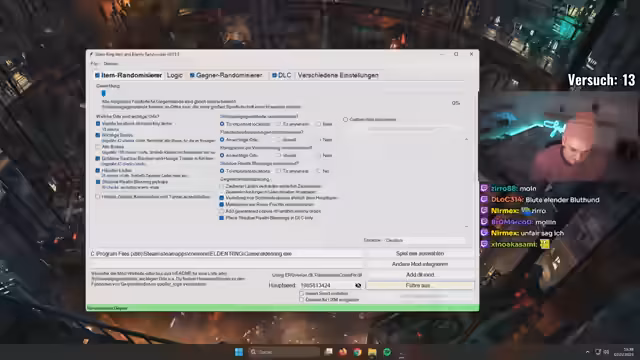 03:01:56Zu Beginn des Streams wird ein Randomizer-Run mit dem Gitarren-Controller geplant. Der Streamer nutzt die Platz der Entdecker-Startoption, in der Hoffnung, Schadens-Boosts wie Blutung oder Firebone Arrows zu erhalten. Es wird angekündigt, dass dieser Run höchstwahrscheinlich nicht alle Bosse umfassen wird, da selbst der erste Boss-Gegner, Godric, als extrem schwierig angesehen wird. Während eines frühen Kampfes stellt der Streamer mit Frustration fest, dass der verursachte Schaden außergewöhnlich niedrig ist, was seine Demotivation erhöht.