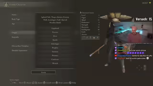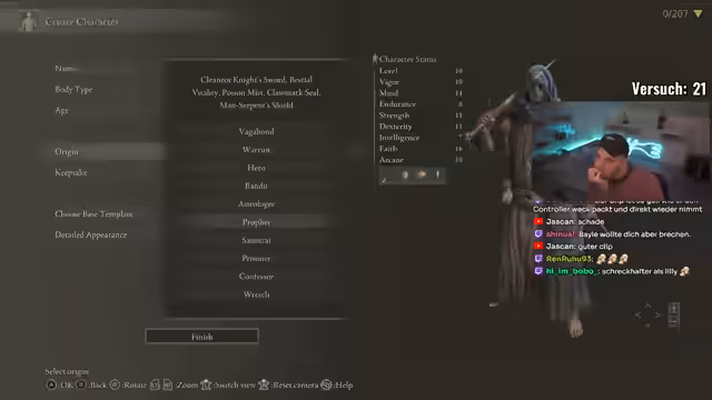 02:09:59Nach einigen unglücklichen Kämpfen konzentriert sich der Streamer auf das Sammeln und Verkaufen von Items, um Gold und Ressourcen zu akkumulieren. Ein gefundenes Item, die Witching Branches, wird als interessant eingestuft, aber letztlich nicht als optimal angesehen. Er findet seine Lieblingswaffe wieder, die den benötigt Schaden hat, aber nicht verwendet werden kann. Stattdessen wird die Klasse 'Stargazer Erlum Intelligence' ins Auge gefasst, die vielversprechend, aber auch anspruchsvoll ist.