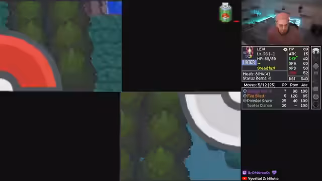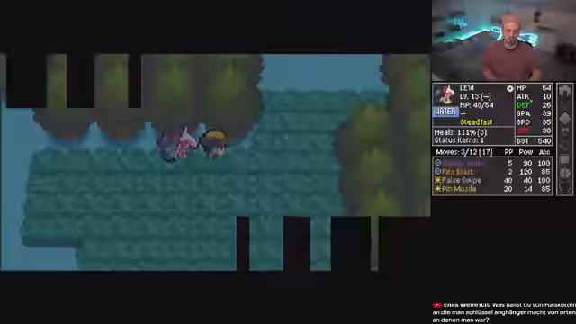 03:39:01Nachdem alle Trainer auf der Route besiegt wurden, wird der erste Arenenkampf angetreten. Hier wird das Pokémon Leviathan versehentlich paralysiert, was die Kampfperformance erheblich einschränkt, da die Angriffswahrscheinlichkeit sinkt und die Geschwindigkeit reduziert wird. Die Regeln der Kaizo-Ironmon-Challenge sind streng: Der Streamer darf außerhalb von Kämpfen keine Heilgegenstände kaufen oder nutzen, darf Pokémon nicht außerhalb von Dungeons wechseln und darf pro Dungeon nur einmal eintauchen.