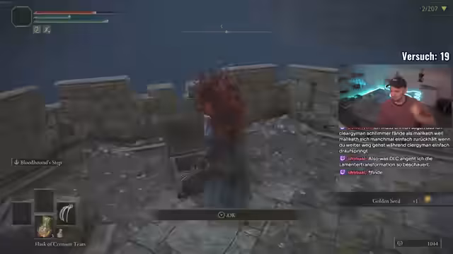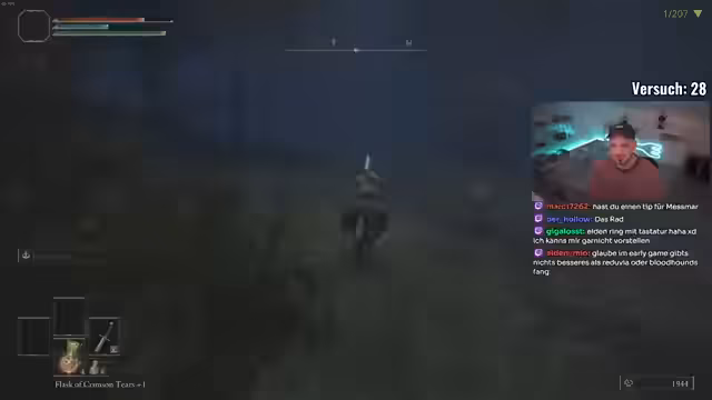 01:40:22Nachdem der Streamer die Great Rune einsetzt und auslöst, steigen die Lebenspunkte und andere Attribute an. Dies führt zu der Notwendigkeit, 25 Decks und 17 Arcane zu leveln, was anfangs als schwierig erscheint, da die benötigten Statpunkte nicht erreicht werden. Der erste Bosskampf, ein Astell-Klon, scheitert, da der Boss nicht spawnt. Stattdessen werden Gegner in Limgrave bekämpft, wobei die Crystal Darts als schwache, aber funktionale Waffe bewertet werden. Ein späterer Kampf gegen Black Tusk Knights wird erwähnt.