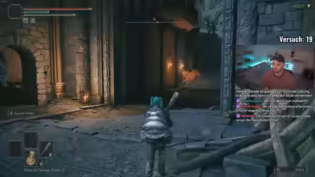 05:14:41Der Streamer kämpft gegen mehrere Bossgegner, darunter Gideon. Obwohl er gute Damage mit seiner Waffe macht, gelingt es ihm nicht, den Boss zu besiegen, da seine Waffe zu langsam für dessen schnelle Angriffe ist. Ein wiederkehrendes Problem sind Todesfälle durch unvorhergesehene Spielmechaniken, wie versehentliches Runterfallen von Abgründen oder das Fehlschlagen von Sprüngen, was zu Frustration und Selbstironie führt.