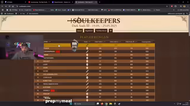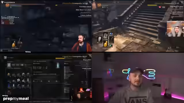 00:43:11Nach dem erfolgreichen Ersten Bosskampf wird der Fortschritt fortgesetzt. Gustaf sammelt Items, hält sich auf Abstand von DLC-Gegnern und plant sein Vorgehen. Es gibt eine Diskussion über die Waffenaufwertung und den Umgang mit Items. Ein wichtiges Ereignis ist der Start der gemeinsamen Watch-Party mit anderen Streamern, insbesondere mit 'Lord Pappnase' und 'Leon', die an einem NoDeath Randomizer teilnehmen und im Chat über deren Fortschritte diskutiert wird.