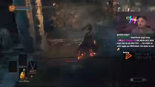 00:14:00Der Stream erleidet einen frühen Rückschlag, als Gustaf im Gebiet der Flammen-Zwillinge infiziert wird und ohne Fackel stirbt. Nach einem Neustart werden spürbare Unterschiede im Gameplay deutlich. Ein langsamerer Aufbau der Ausdauer und die ständige Anwesenheit von DLC-Gegnern machen den Run deutlich schwieriger. Der Streamer entscheidet sich, seine schlechte Startwaffe abzulegen und probiert eine neue, bessere Waffe aus, die mehr Spaß macht und mehr Schaden verursacht, auch wenn sie sich beim Gebrauch holprig anfühlt.