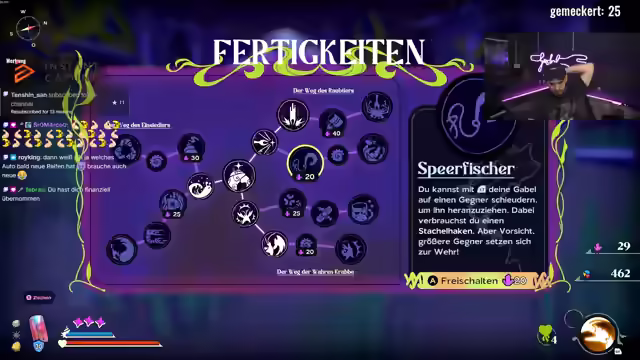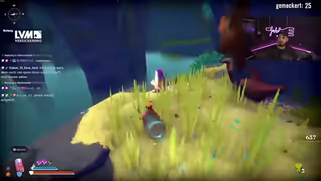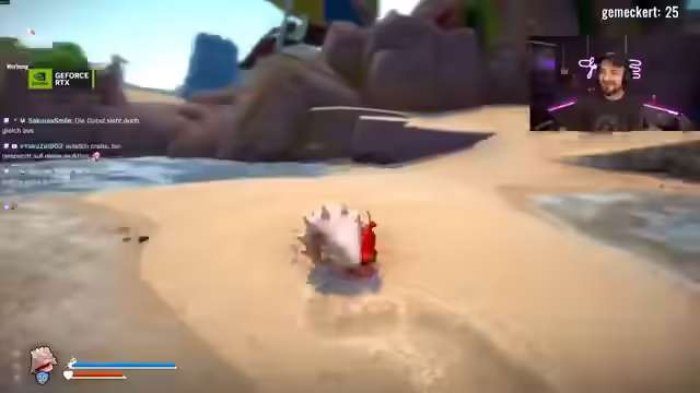 00:29:56Der Streamer erkundet das Wattenmeer und trifft auf eine Zigarette, die ihm von der Herzogin erzählt, die jetzt das Sagen hat und Steuern erhebt. Er erfährt, dass die Herzogin ein Schloss baut und Soldaten anheuert. Er macht sich auf den Weg zum Schloss, um das Missverständnis mit den Steuern aus dem Weg zu schaffen. Unterwegs trifft er auf eine übellaunige Schnecke, die ihn als Schmarotzer beschimpft. Er entdeckt, dass die Gegend mit Zigaretten abgesteckt ist und fragt sich, ob es sich um eine Open-World handelt. Er stellt fest, dass er keine Ausdauer hat und immer zuschlagen und rollen kann. Er findet blinde Passagiere, die er eintauschen kann, und entdeckt Fertigkeiten, die er freischalten kann. Er bemerkt, dass das Spiel zwar gechillt ist, aber tatsächlich ein Soulslike ist. Er findet eine Batterie, die ihm Schaden zufügt, und stellt fest, dass er drei Heilungen hat. Er entdeckt, dass er mit aufgeladenen Angriffen Gegner micro-staggern kann.