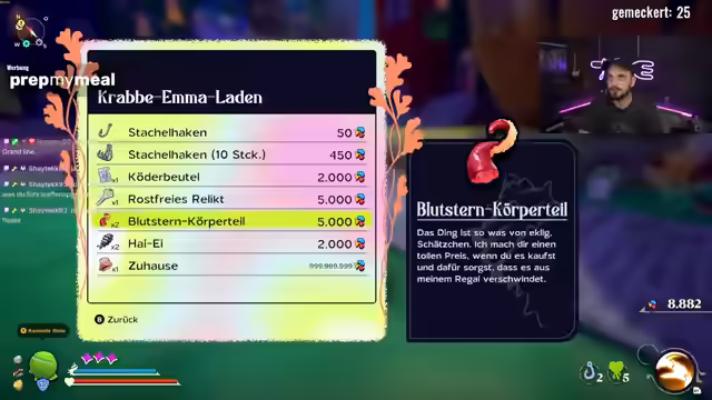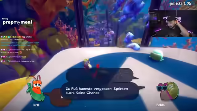 00:26:21Es wird die Konsequenz des Sterbens im Spiel erläutert: Der Verlust des gesamten Mikroplastiks und des Panzers. Der Streamer stirbt das erste Mal und holt seinen Müll zurück. Er spricht über die anfänglichen Schwierigkeiten mit der Kameraführung und das Timing beim Ausweichen. Er erklärt, dass das Spiel ein Soulslike ist. Er entdeckt die Möglichkeit, sich in leuchtenden Meeresströmungen auszuruhen und die Bedeutung von Mikroplastik für Levelaufstiege. Ein Charakter erklärt, dass man sich von Mikroplastik reinigen kann, um Energie zu gewinnen, oder es gegen interessante Sachen eintauschen kann. Der Streamer interagiert mit einem Charakter, der seine Muschel zurückfordert und ihn auffordert, sich einen Job zu suchen, um sie zurückzubekommen. Er erkundet die Spielwelt, findet Brotkrallen und tauscht sie gegen Mikroplastik ein. Er trifft auf einen Krebs, der ihn nach einem Hai mit einer Muschel fragt.