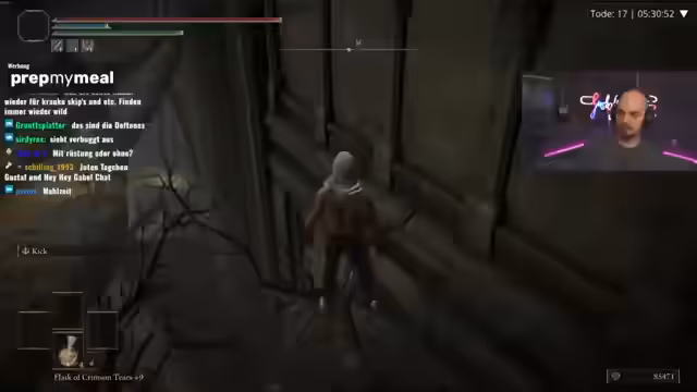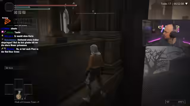01:30:46Nachdem der Sprung auf eine Plattform gelungen war, stieß der Streamer auf eine unsichtbare Wand, die den weiteren Fortschritt blockierte. Durch Neustart des Spiels konnte die Position problemlos durchlaufen werden, ein bekanntes Phänomen bei Spielladezeiten. Anschließend erfolgte ein Versuch, eine Sprungsequenz nach links auszuführen, was machbar, aber herausfordernd schien. Währenddessen wurden alternative Waffen wie eine große Drachen-Katana als Option in Erwägung gezogen, bevor der Fokus wieder auf das bestehende Ziel gerichtet wurde.