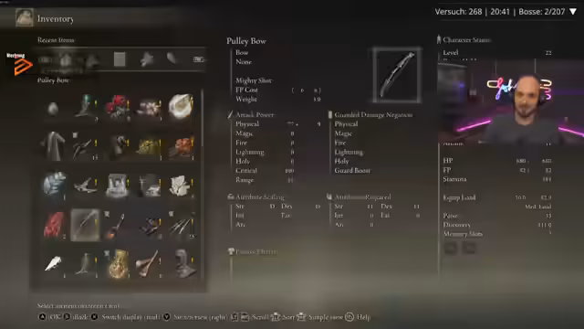 01:40:11Nach dem Erfolg konzentrierte sich der Streamer auf die Vorbereitung des Builds für die kommende Waffe, Oporia. Dies beinhaltete den Kauf mehrerer Waffen und Schmiedesteine, was als 'sehr, sehr teuer' eingestuft wurde. Da der einzige verfügbare Zehnerstein bereits verwendet wurde, musste nach Alternativen gesucht werden. Die Entscheidung fiel darauf, die Waffe Oporia mit dem Fokus auf Glaube (Faith) zu spielen und die Statistiken entsprechend anzupassen.