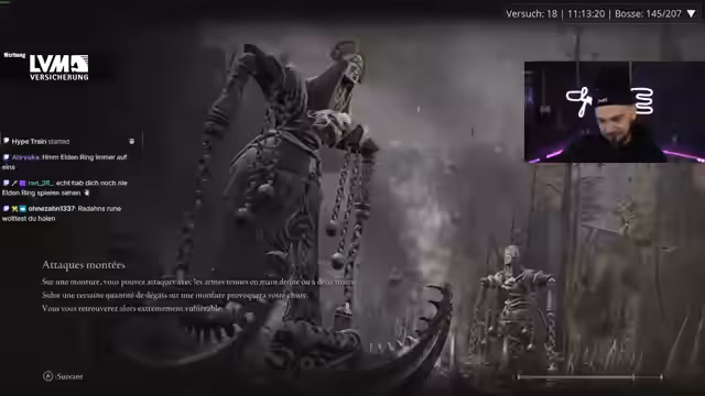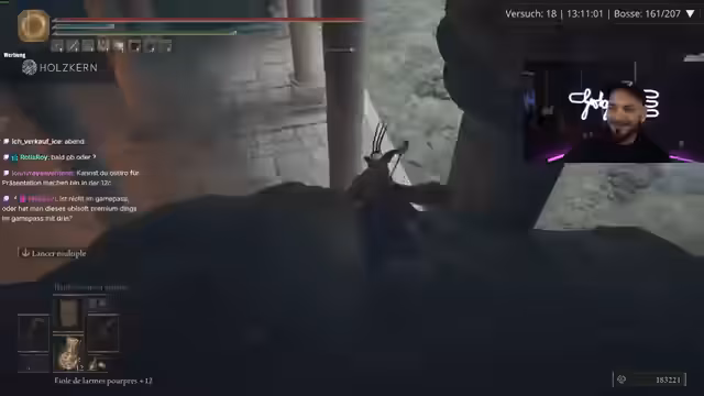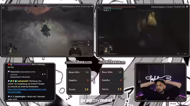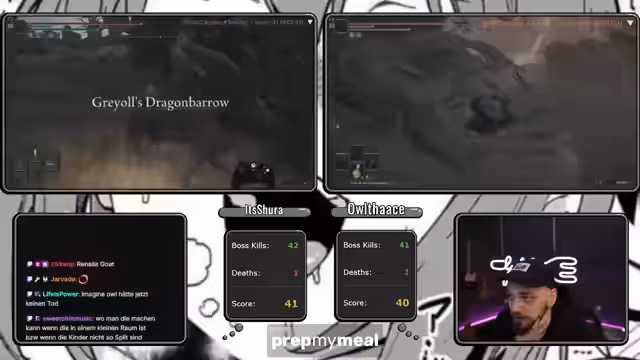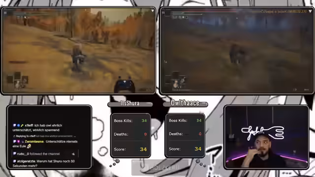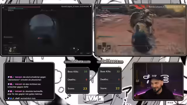 02:20:29Gustaf kommentiert live einen Wettkampf zwischen den Streamern Shura und Owl im französischen Community-Event. Shura überzeugt durch präzises Stamina-Management und kontrolliertes Gameplay, während Owl einen aggressiveren Ansatz mit Frost-Waffen zeigt. Der Vergleich der Spielstile und die Diskussion über Klassenwahl (Vagabond als Favorit) sowie Community-Größenunterschiede zwischen deutschen und französischen Streamern stehen im Fokus.