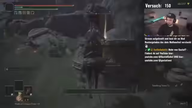 02:40:03Nach überstehen des ersten Bosskampfes konzentriert sich der Streamer auf die Verbesserung seines Inventars. Er findet und sammelt Items wie den Helm der Nacht und eine Rune der Erinnerung, was ihm etwas Erleichterung bringt. Gleichzeitig bemängelt er, dass ihm wichtige Ausrüstungsgegenstände wie Geld und nützliche Waffen bisher gefehlt haben, was seinen Fortschritt stark behindert.