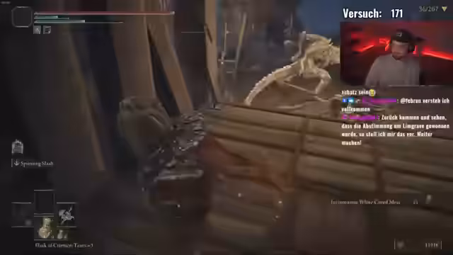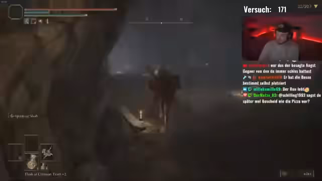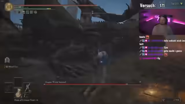 01:21:59Eine zufällige Begegnung mit einem bisher in der Overworld unerwarteten Boss löst eine Diskussion aus, ob dieser aufgrund seiner Mechanik nur in der Boss-Arena erscheinen kann. Der Streamer findet eine zweite Remembrance, was zu Gesprächen über die Waffenausrüstung führt. Er testet verschiedene Kombinationen von Gift, Blut und Rot und erkennt, dass Gift und Rot eine sehr effektive Kombination für seinen Build darstellen. Er stellt fest, dass sein Frost-Red-Blade keine Gift-Wirkung zulässt und alternative Waffenausrüstungen in Betracht zieht.