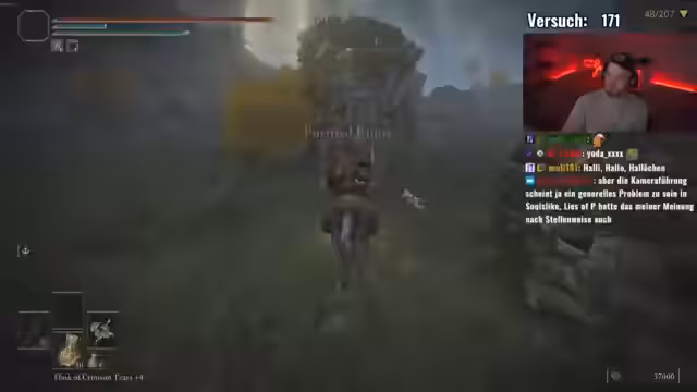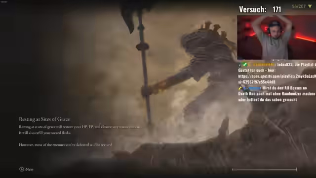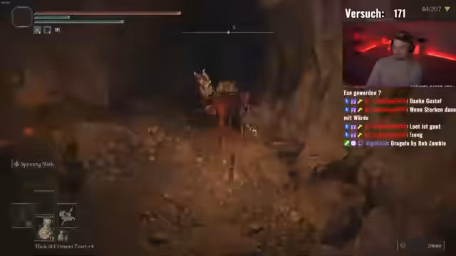 01:44:21Nach einem längeren, erfolgreichen Kampf gegen einen als schwierig geltenden Boss ist der Streamer sichtlich erleichtert und froh, diesen aus dem Weg geräumt zu haben. Er erwähnt den ersten Brecher, den er ausgeschaltet hat, und dass es ihm viel Bock auf den Nächsten macht, Radahn P2. Er ist sich aber unsicher, ob er diesen Boss im späteren Spielverlauf mit dessen hohen Verteidigungswerten überhaupt noch bezwingen kann, da er viel Fehlerfreiheit erfordern würde. Er positioniert sich für den nächsten Kampf.
