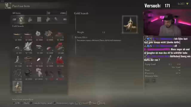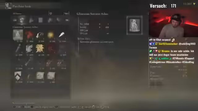 00:06:58Der Stream beginnt mit der Begrüßung der Zuschauer und der Vorstellung von Gustav MF, der ab Freitags 14 Uhr streamt. Der Fokus liegt auf dem Spiel Elden Ring, für das der Streamer eine hohe Bewertung von zehn von zehn gibt. Ein gemeinsamer Spiel-Seed mit dem User @seriouschallenges wird vorbereitet, wobei der Streamer seine Startklasse und das Setup mit acht Bossen vorstellt. Der Start des Seeds gestaltet sich ungewöhnlich, da ein gefundenes Item, der Battlehammer, bereits auf den ersten Blick das Ergebnis eines gezielten Picks sein könnte, was der Streamer fasziniert und gleichzeitig verwirrt.