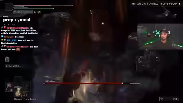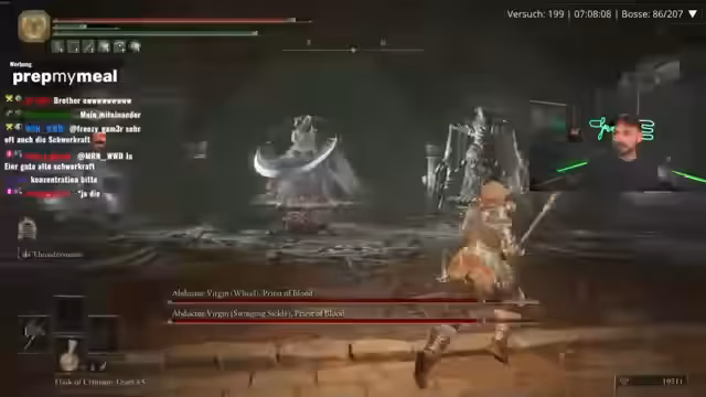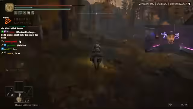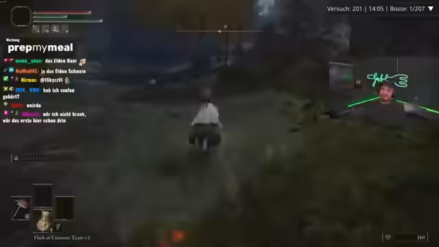 05:40:24Die Intensität der Challenge steigt, als der Streamer gegen gefährliche Bosse wie den Blackblade Kindred kämpfen muss. Er beschreibt die Kämpfe als sehr nervös und schädlich für seine Gesundheit, erwähnt ein Problem mit seiner Nase, das ihn ständig ablenkt, und äußert Enttäuschung über ein zuvor gekauftes, trockenes Grillhähnchen. Trotz der Frustration bleibt der Drang, die Challenge zu meistern, und er bittet den Chat um Glückwünsche und Unterstützung für die verbleibenden Bosse.