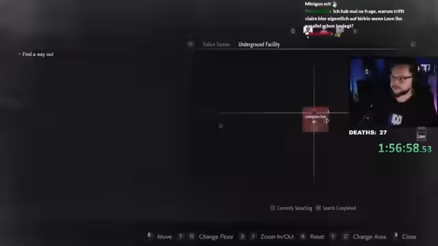 05:00:23Die Streamerin realisiert, dass sie es mit mehreren Mr. X zu tun hat: einer im Graveyard, einer in der Bibliothek und ein weiterer, der im Stars Büro spawnt. Es wird überlegt, wie man diese Gegner am besten handhabt und wo man sie verbargen kann. Der Plan, den zweiten Mr. X im Chief Irons Büro zu verbargen, wird diskutiert. Es wird festgestellt, dass Mr. X bestimmte Türen mit Fenstern nicht durchqueren kann. Die Streamerin äußert den Wunsch, zum Friseur zu gehen, fühlt sich aber unwohl wegen eines bevorstehenden Termins. Es wird kurz überlegt, etwas zu trinken zu holen. Die Bibliothek soll gesprengt werden, aber von der Uhrenturmseite aus. Die Streamerin vermutet, dass sie das Maschinengewehr finden wird und überlegt, ob sie vorher speichern soll.