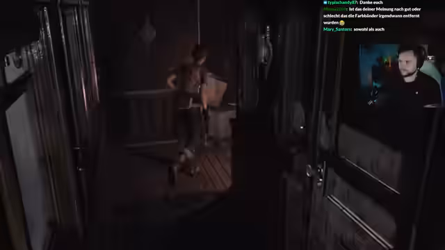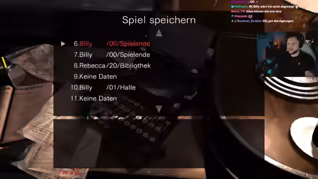 01:55:55Der Stream beginnt mit einem Zugunglück im Resident Evil Zero. Die Spielerin erkundet den Zug, wechselt zwischen den Charakteren Rebecca und Billy und muss sich gegen aufständische Zombies verteidigen. Es gibt Panik, weil lange nicht gespeichert wurde. Die Protagonistin findet eine Bedienungsanleitung für die Zugbremsen, die einen komplizierten Aktivierungsprozess mit einem Magnetkarten-Leser erfordert. Sie sucht verzweifelt nach der Magnetkarte, während der Zug immer schneller wird und die Spannung steigt.