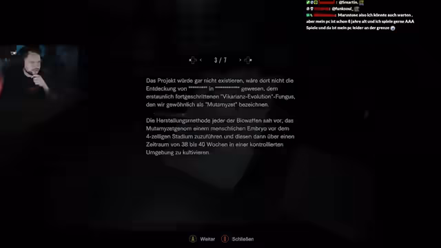05:52:02Auf dem Schiff werden wichtige Dokumente und Tonbänder entdeckt, die die Hintergrundgeschichte von Evelyn enthüllen. Dabei wird offenbart, dass Evelyn eine Bio-Waffe auf Pilzbasis ist, die von einer geheimen Organisation, möglicherweise Umbrella, geschaffen wurde. Der Streamer liest einen Bericht über die biologischen Experimente und die Entstehung von Evelyn, während er mit dem Gameplay fortfährt. Es werden auch Erklärungen zu den Halluzinationen und der Kontrolle durch den Pilz gegeben, die die Handlung des Spiels vertiefen.