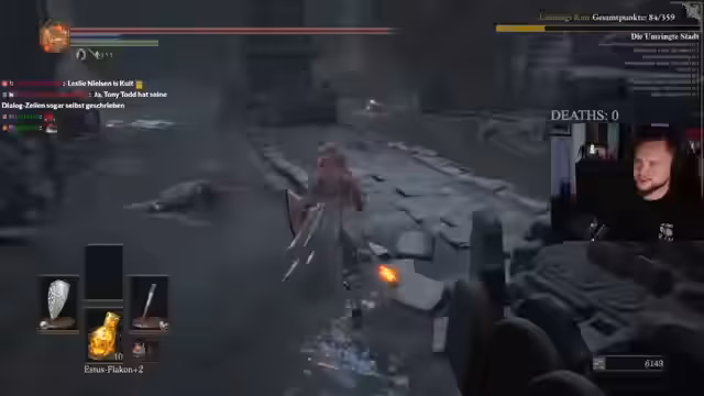 00:27:23Der Streamer kämpft gegen einen Gegner und erleidet unnötigen Schaden. Er erwähnt Pontiff Sulyvahn, aber es bleibt unklar, ob es sich um einen echten Bosskampf handelt. Der Streamer hat einen Streit mit einem Chat-User, den er für dumm hält, und reagiert beleidigend. Er erwähnt die hohe Anzahl von No-Death-Runs im Chat und denkt daran, offline zu gehen, um anderen Runs zuzusehen, da es ihm Spaß macht, aber frustrierend ist, wenn er selbst nicht spielt.