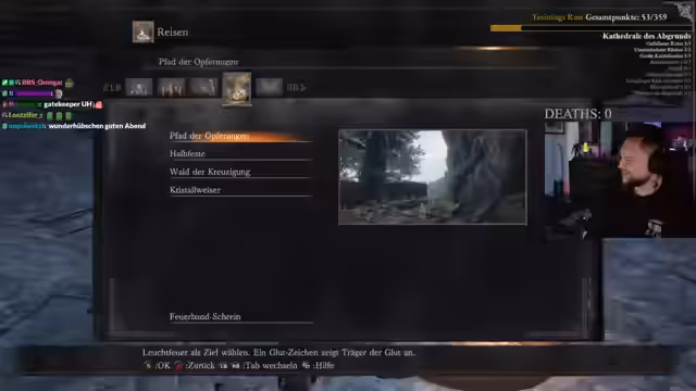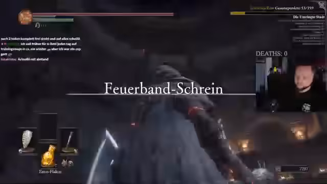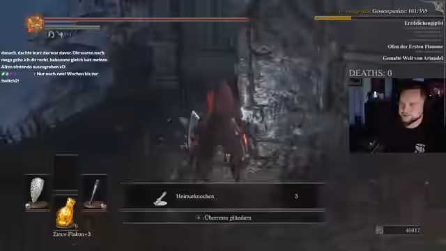 00:17:40Nach dem Erreichen des Leuchtfeuers 'Feuerbandschrein' reist der Streamer zurück zum Anfangsgebiet, um im Bereich des Waldes der Riesen weiter zu üben. Er erwähnt ein geplantes Treffen mit Leon am Samstag für einen Run und geht gezielt auf das Management von Estus-Flaschen und Seelen ein. Er stellt klar, dass im echten Run lieber mehr verbraucht als tot zu werden ist. Eine wichtige Erkenntnis ist, dass der Geist NPC Metashi erst verschwindet, wenn man den Baum, nicht aber wenn man den Priester besiegt.