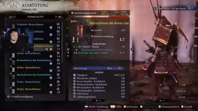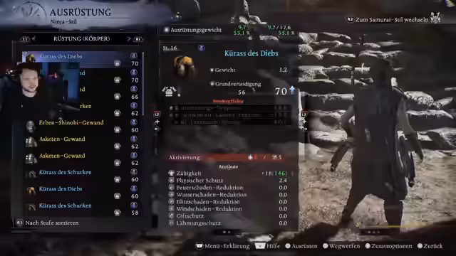 00:29:24Im Menü wird die gesammelte Ausrüstung bewertet und optimiert. Ein neues Katana mit Feuerangriff und Gesundheitsentzug wird ausgerüstet, das dem Streamer erlaubt, durch Schaden zu heilen. Die Inventarverwaltung wird fortgesetzt, wobei graue und ungeeignete Gegenstände verkauft werden. Die Gewichtsgrenze wird erreicht und der Streamer stellt fest, dass er Ausdauer leveln muss, um mehr tragen zu können.