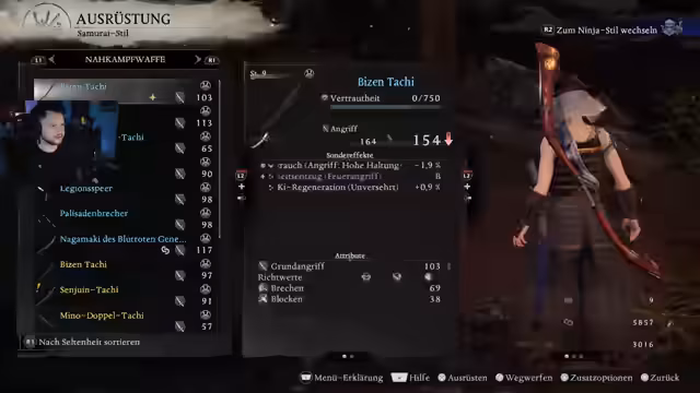 00:53:48Das Spiel wird als Souls-Like mit typischen Mechaniken wie Parry, Ausweichen und Lebensverlust bezeichnet. Wichtige Mechaniken werden erklärt, wie die Tastenbelegung für die Schutzgeistfähigkeit oder die Nutzung des Geistekraft-Meters. Die Funktion der Haltungswechsel bei erfolgreichem Schlüssel-Impuls wird erwähnt, die Ausdauer regeneriert. Der Streamer experimentiert mit Ninja- und Samurai-Haltungen und den dazugehörigen Fähigkeiten.