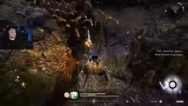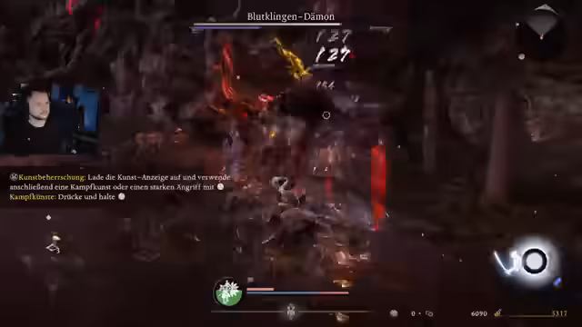 00:10:04Der Streamer kämpft gegen einen blutklingenden Dämon und stellt fest, dass der Sound des Spiels seltsam ist. Nach einem ersten Sieg wird der Boss erneut herausgefordert, um mehr Loot zu erhalten. Dazwischen gibt es eine umfangreiche Auseinandersetzung mit dem Inventar. Unerwünschte Ausrüstung wird verkauft, um Platz für bessere Items zu schaffen. Die Kodama-Sägen zur Erhöhung des Elixir-Drops werden aktiviert und neue passive Fähigkeiten werden freigeschaltet.