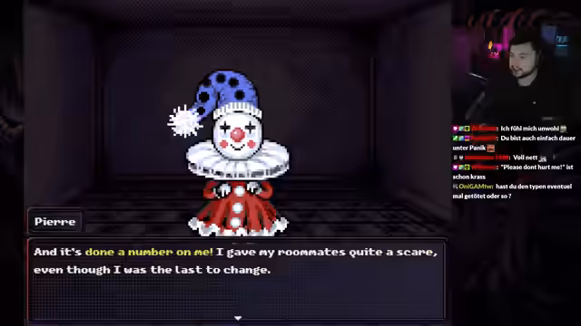 06:21:52Nach einer kurzen Pause zum Essen beginnt der Fokus auf die Erkundung und das Auffinden von Gegenständen. Eine Begegnung mit einem schweigsamen, Schneemann-ähnlichen Charakter namens Pierre steht im Mittelpunkt. Die Kommunikation gestaltet sich schwierig, da der NPC nicht antwortet und der Spielerin Rätselraten bleibt. Sie entscheidet sich, den Namen "HollyLP" anzunehmen, um weiter mit ihm zu interagieren, was zu einem ungewöhnlichen Dialog über einen Clown und dessen Verhältnis zu ihr führt. Später findet sie eine Zunge, die sie aber zunächst nicht nutzen kann.