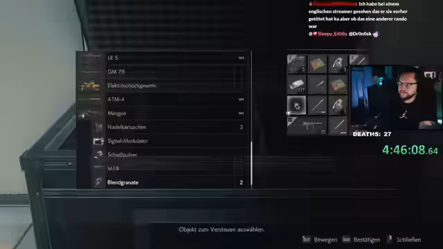 02:55:56Auf dem Weg zu einem neuen Bereich, vermutlich einem Zug, müssen Platzmangel und Inventarverwaltung optimiert werden. Die Streamerin entscheidet sich, eine Pistole abzulegen, um Platz für eine Minigun zu schaffen, die sie als entscheidend für den bevorstehenden Bosskampf gegen Birkin ansieht. Die Suche nach Munition und die Notwendigkeit von Heilung bleiben zentrale Punkte bei der Vorbereitung.