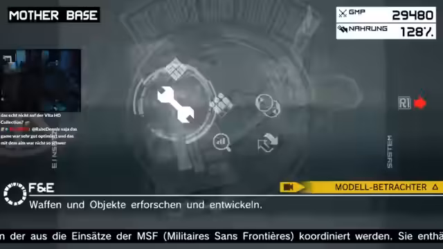 04:32:56Die Aktivitäten verlagern sich auf die Organisation der Mother Base. Nebenmissionen, sogenannte 'Zielübungen', werden erwähnt, um Waffentechnik zu trainieren. Die Herausforderungen der gleichzeitigen Waffenentwicklung werden angesprochen, da jede zusätzliche Entwicklung die Gesamtverlängerung beeinflusst. Der Streamer speichert den Fortschritt und stellt fest, dass C4 als Sprengstoff gerade in Entwicklung ist und er auf die Fertigstellung warten muss, um fortzufahren.
