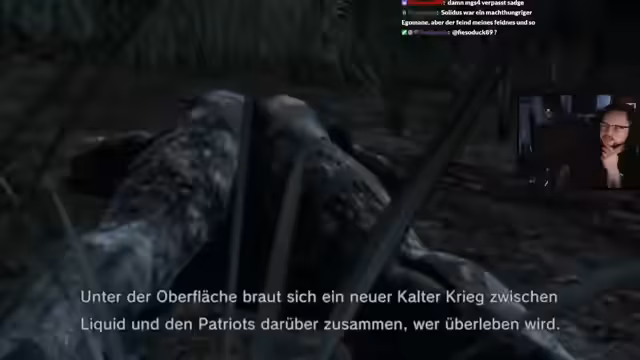 01:00:39Nach mehreren technischen Problemen beginnt endlich der eigentliche Gameplay-Teil von Metal Gear Solid 4. Der Streamer spielt den ersten Akt 'Liquid Sun' und bewundert das Design des Spiels, insbesondere die Tarnmechanik. Er kommentiert die Grafik und das Gameplay, bemerkt aber auch einige Schwächen wie die KI der Gegner. Der Streamer interagiert mit dem Chat, zeigt verschiedene Gameplay-Elemente wie das Betäubungsmesser und die Octocamo-Funktion, und reagiert auf die Handlung des Spiels.