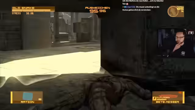 01:40:52Der Streamer erkundet die Stealth-Mechaniken von Metal Gear Solid 4 und stellt Fragen zur Zielaufnahme von Gegnern. Er erwähnt seine einzige Waffe, die AK, und sucht nach Möglichkeiten, Gegner auszuschalten, ohne Alarm auszulösen. Er spricht über Gameplay-Elemente wie Schalldämpfer und deren Funktionen, während er versucht, sich lautlos durch die Spielumgebung zu bewegen. Er erwähnt auch seine Schwierigkeiten mit der Erkennung von Items im Spiel und vergleicht Metal Gear Solid mit Splinter Cell.