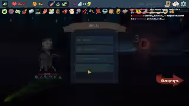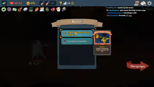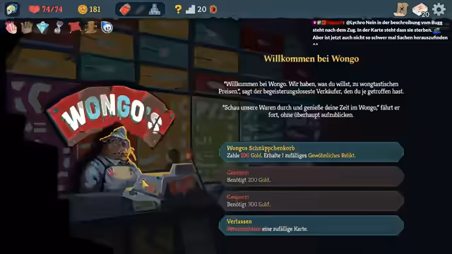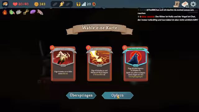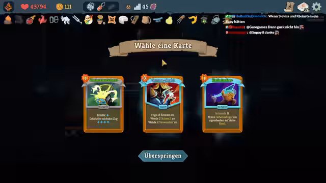 01:40:02Der Streamer kämpft gegen einen aggressiven Elite-Gegner, der ihm großen Schaden zufügt. Er entdeckt neue Karten und Händler, darunter 'Vorbereitung Schlag' und einen Fake-Händler, der abgeschwächte Karten anbietet. Eine Lavalampe würde TP heilen, passt aber nicht zu seinem Build. Der Streamer strebt danach, Elite-Gegner zu töten, um Belohnungen zu erhalten, und wählt einen Weg mit vielen Events. Er trifft auf einen Gegner, der Buffs nutzt, und stellt die Stärke der neuen Mächte fest.
