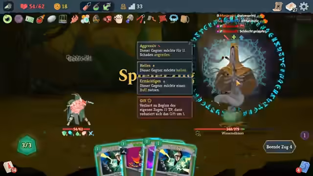 03:27:25Der Streamer bereitet sich auf den Bosskampf gegen den 'Wissensdämon' am Ende des Akts vor. Er wählt eine Belohnung, die keine Karten enthält, und ist damit zufrieden. Im Kampf gegen den Dämon stellt er fest, dass dieser ihn mit einem Debuff namens 'Benommen' belegt, wenn er angegriffen wird. Um dies zu vermeiden, verzichtet er auf einen Angriff und zieht stattdessen Karten, um den Debuff auf die Hand zu ziehen. Der Kampf wird als heftig beschrieben, da der Dämon zwei Debuffs anbietet, von denen man einen wählen muss.